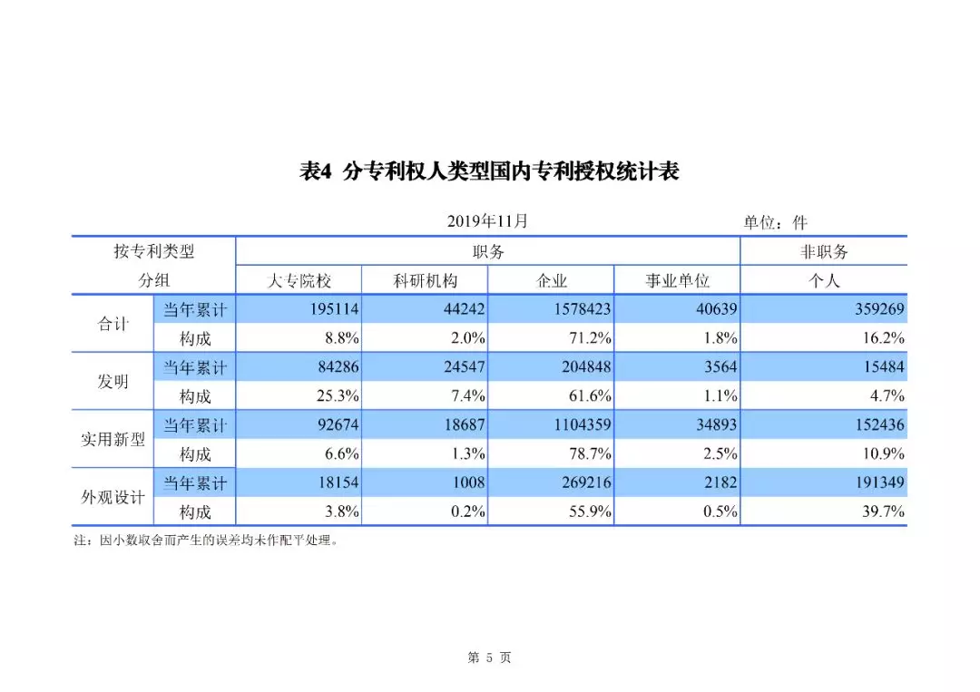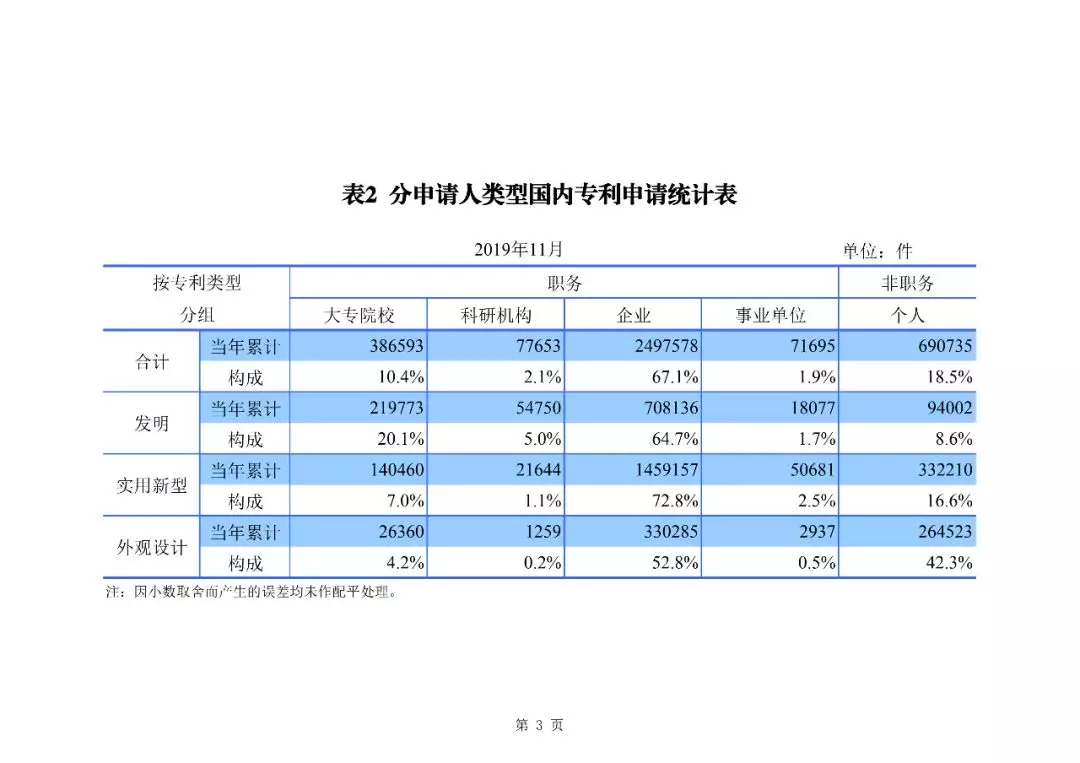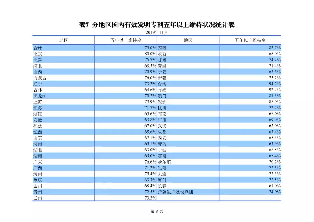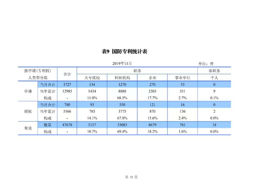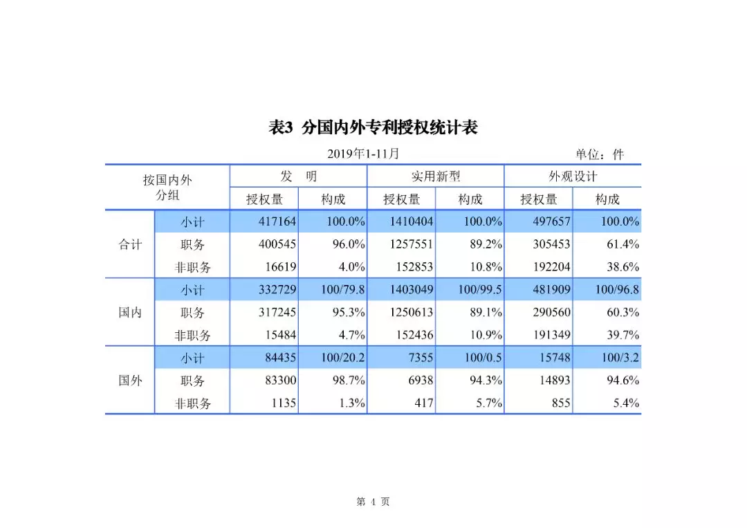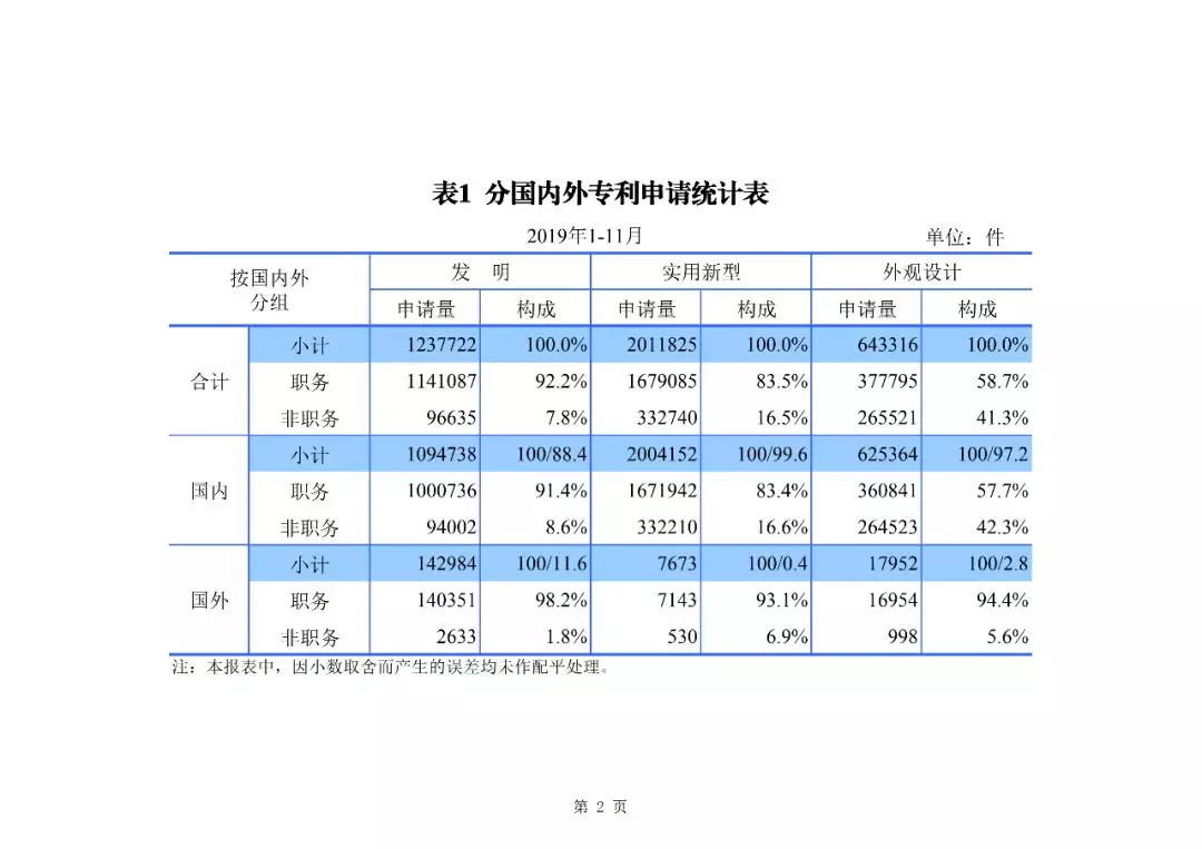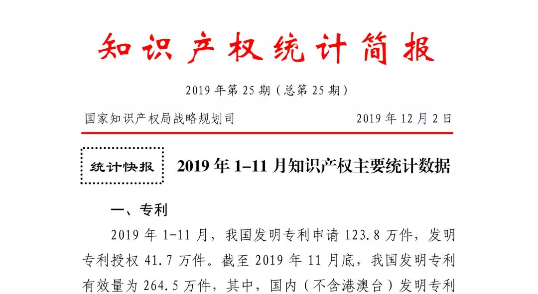 2019年1-11月,我國發明專利申請123.8萬件,發明專利授權41.7萬件。截至2019年11月底,我國發明專利有效量為264.5萬件,其中,國內(不含港澳臺)發明專利有效量184.0萬件,每萬人口發明專利擁有量達到13.2件。