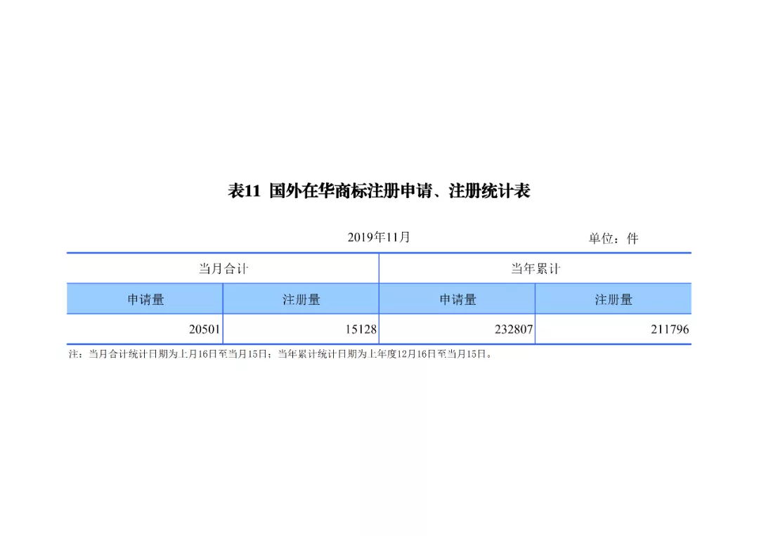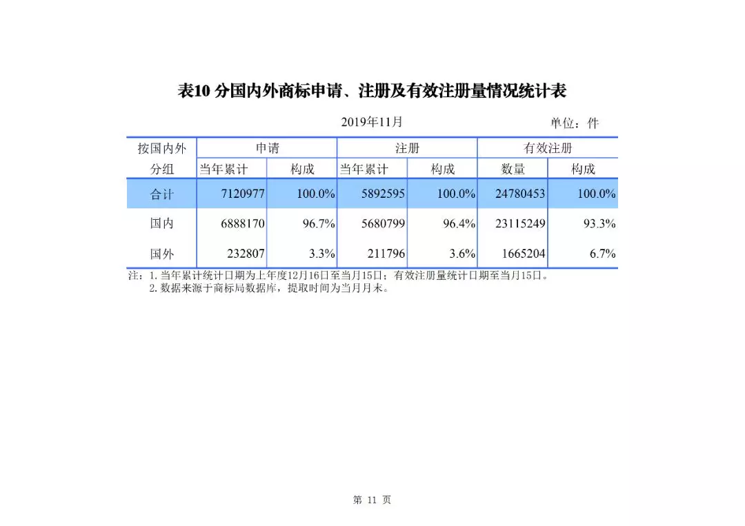 2019年1-11月,我國商標申請量為712.1萬件,商標注冊量為589.3萬件。截至2019年11月底,有效注冊商標量2478.0萬件。