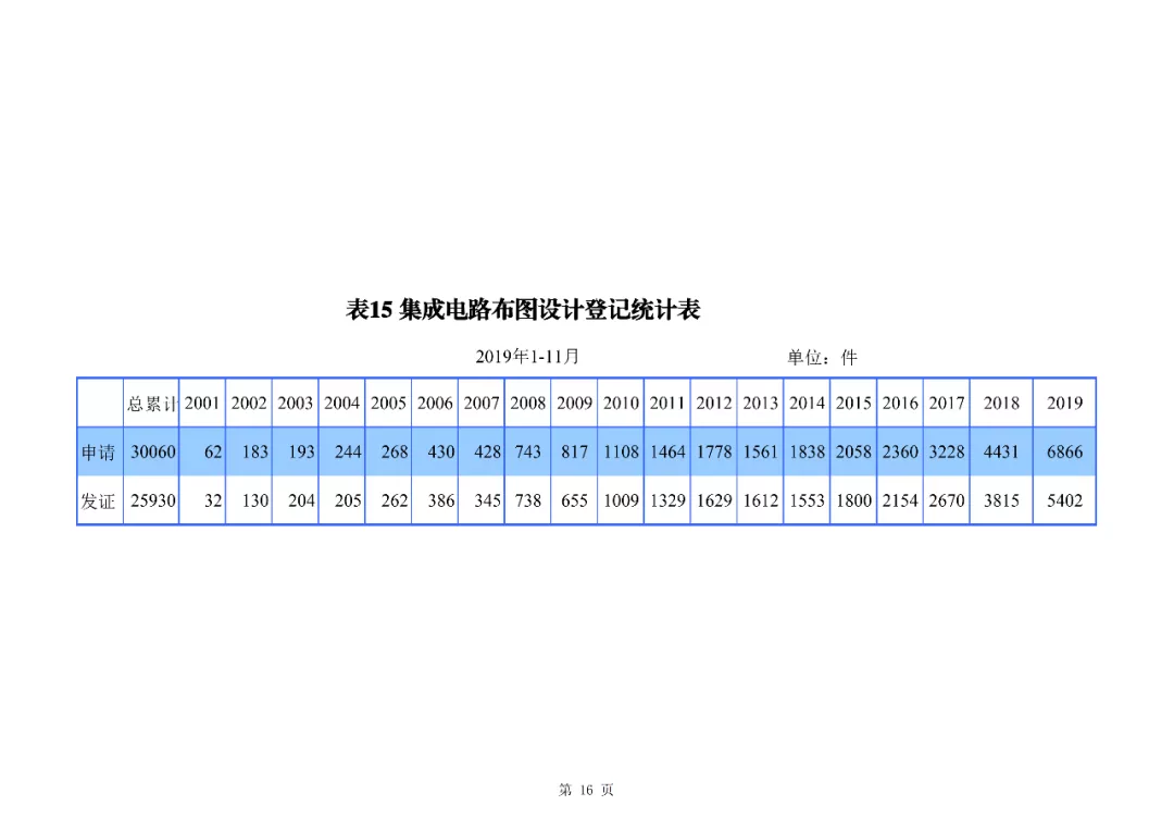 2019年1-11月,集成電路布圖設計登記申請6866件, 發證5402件。