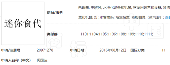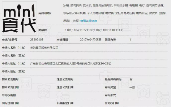 2017年4月5日,美的集團申請注冊了第23399105號“食代mini及圖”商標(下稱訴爭商標),核定使用在第11類“冰箱; 燃氣鍋爐; 飲水機; 廚房用抽油煙機; 淋浴熱水器; 電暖器; 電燈; 空氣調節設備; 水凈化設備和機器; 個人用電風扇; 電炊具; 烹飪用電高壓鍋; 電熱水壺; 微波爐(廚房用具); 熱泵; ”商品上。