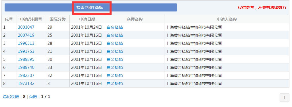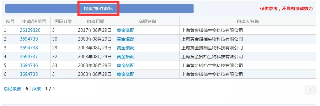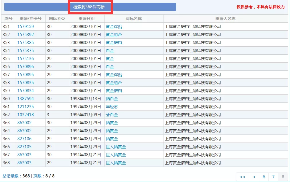 商標局網站查詢發現,目前上海黃金搭檔公司名下共有商標368件,包括“腦白金”、“腦黃金”、“黃金搭檔”等一系列商標。