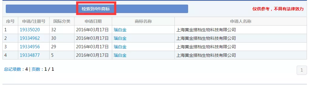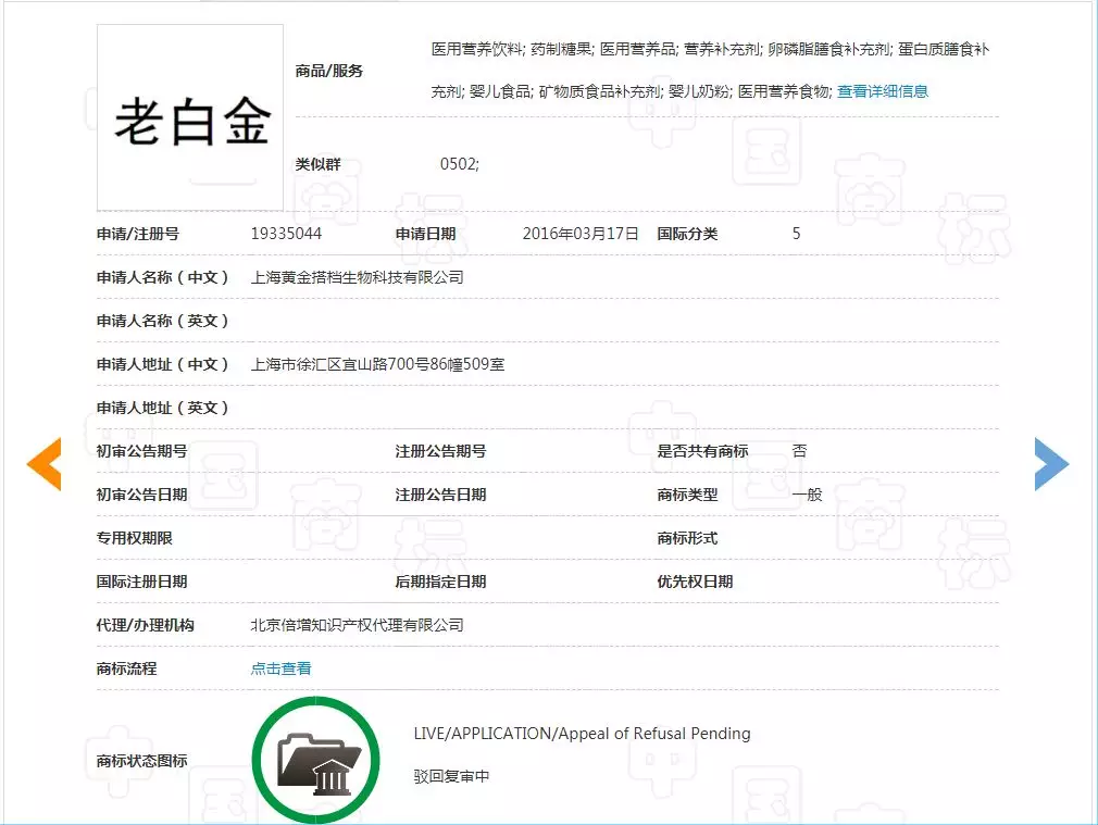 上海黃金搭檔公司于2016年3月17日申請了第19335044號“老白金”商標(以下稱申請商標),核定使用范圍為第5類的“醫用營養飲料,醫用營養品,礦物質食品補充劑,嬰兒奶粉”等商品上。