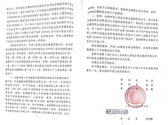 9月22日訊平安健康商標侵權案再起波瀾,市值千億、有“互聯網醫療第一股”之稱的“平安好醫生”賬戶被查封扣押7000萬元。9月21日,好醫生藥業集團收到涼山彝族自治州中院(2020)川34民初31號之二《民事裁定書》,在平安健康互聯網股份有限公司商標侵權不正當競爭糾紛案中,好醫生藥業申請訴中保全申請財產保全,法院依法受理并裁定扣押、查封平安健康互聯網股份有限公司賬戶現金70000 000元,扣押、查封期1年。