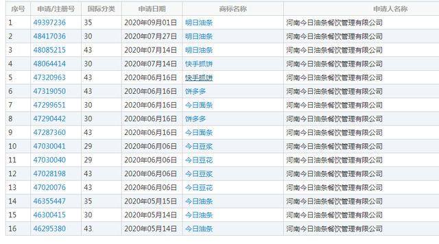 值得一提的是,紅星新聞記者在中國商標網查詢發現,前者在注冊后的第二天就開始申請商標,從5月至今共申請了16個商標,商標包括“今日油條”“餅多多”以及“快手抓餅”等。