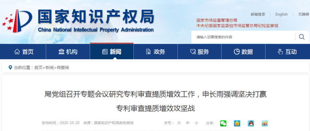 10月15日,國家知識產權局黨組召開會議,專題研究部署專利審查提質增效工作。局黨組書記、局長申長雨主持會議并講話。他強調,要深入學習貫徹習近平總書記關于提高知識產權審查質量和審查效率的重要指示,落實黨中央、國務院決策部署,堅決打贏專利審查提質增效攻堅戰。