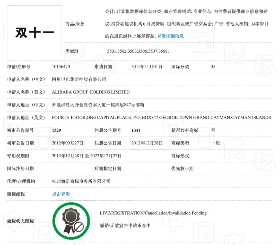 2011年11月1日,阿里集團在第35類廣告等服務上申請注冊了“雙十一”文字商標,并于2012年12月28日獲準注冊。
